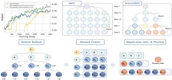 BranchGRPO: Stable and Efficient GRPO with Structured Branching in Diffusion Models Yuming Li*, Yikai Wang*, Yuying zhu, Zhongyu Zhao, Ming Lu, Qi She, Shanghang Zhang International Conference on Learning Representations (ICLR), 2026 [paper] [arxiv] [code] [bibtex] |